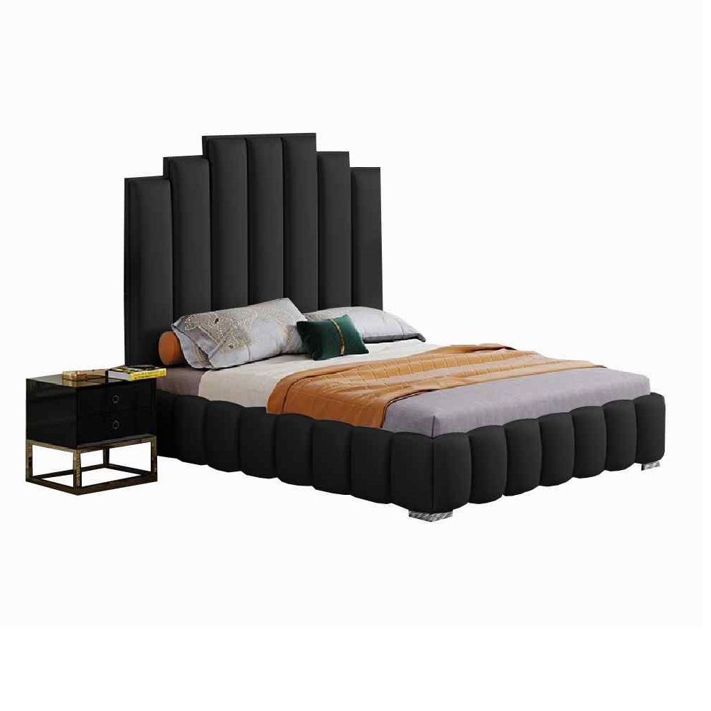 A tall headboard and a beautiful stepping design, this bed frame looks amazing in any room setting. With its luxurious plush velvet fabric, this bed frame just oozes classes and with its chrome metal feet it provides the perfect balance and durability. Solid wooden slats