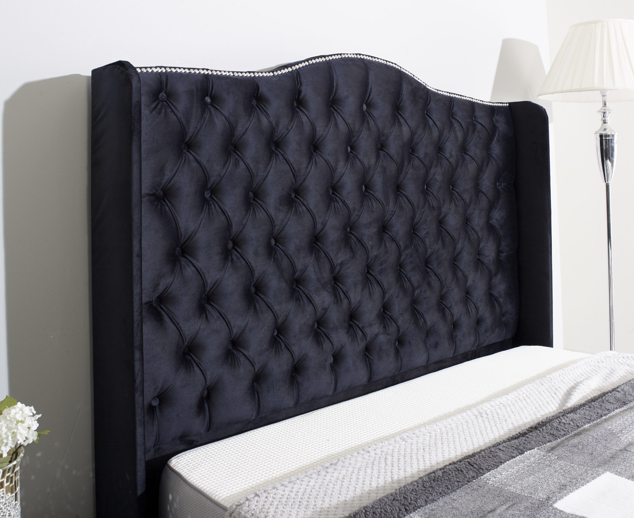 Transform your bedroom and turn it into a sophisticated space with the Saturn Wing bed. Made of solid wood and upholstered in a stunning velvet fabric, the Saturn Wing bed frame is a true definition of style and elegance. It features a large wing headboard and footboard with exquisite button tufts detailing and antique brass trimming for the nailhead. The Saturn Wing bed comes with a solid board base, chrome feet, and a 4-inch solid thick frame for excellent support. Adding this piece of furniture to your bedroom will undoubtedly transform your space. The mattress and other accessories in the image shown for this product are not included in the package. However, you can order them at additional cost and they will be delivered with your Saturn Wing bed frame.